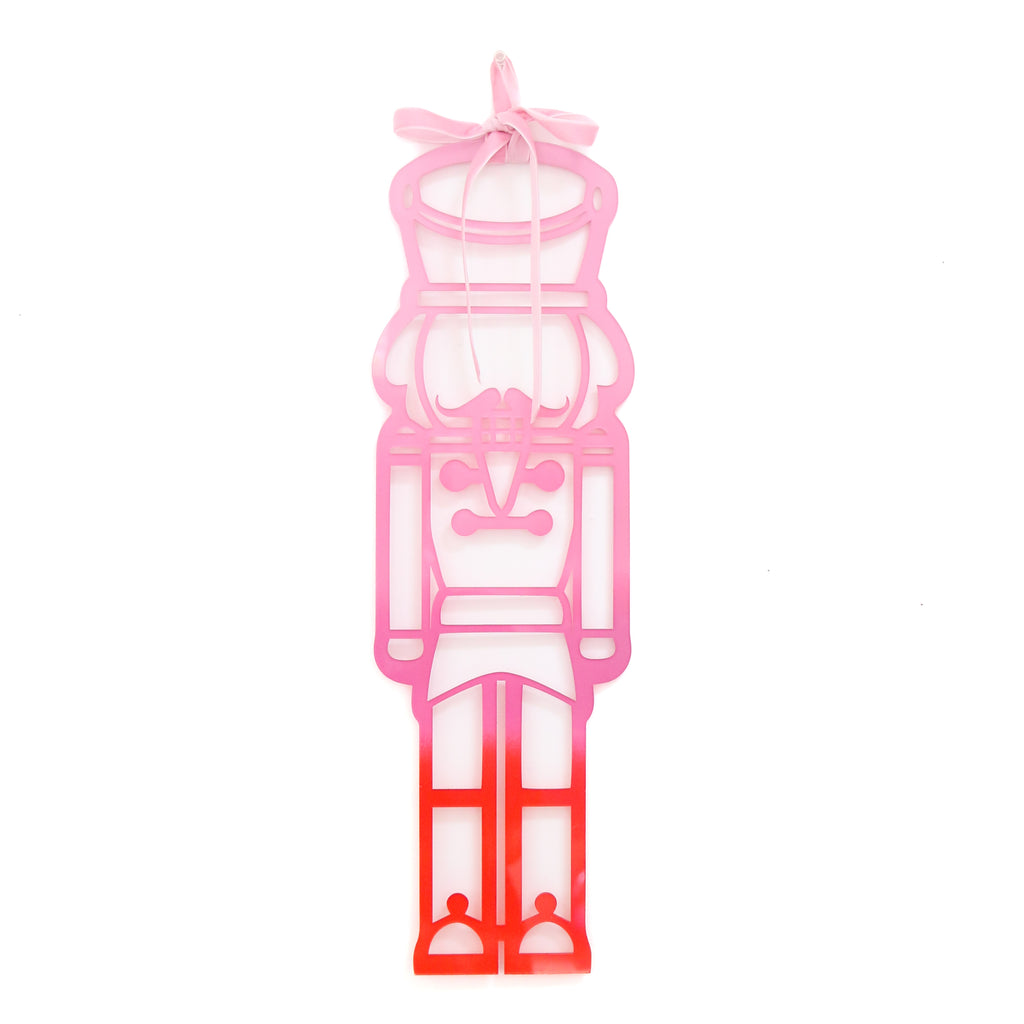 Our acrylic nutcracker hanging art measures 18” tall by 6” wide and comes with ribbon to hang.
