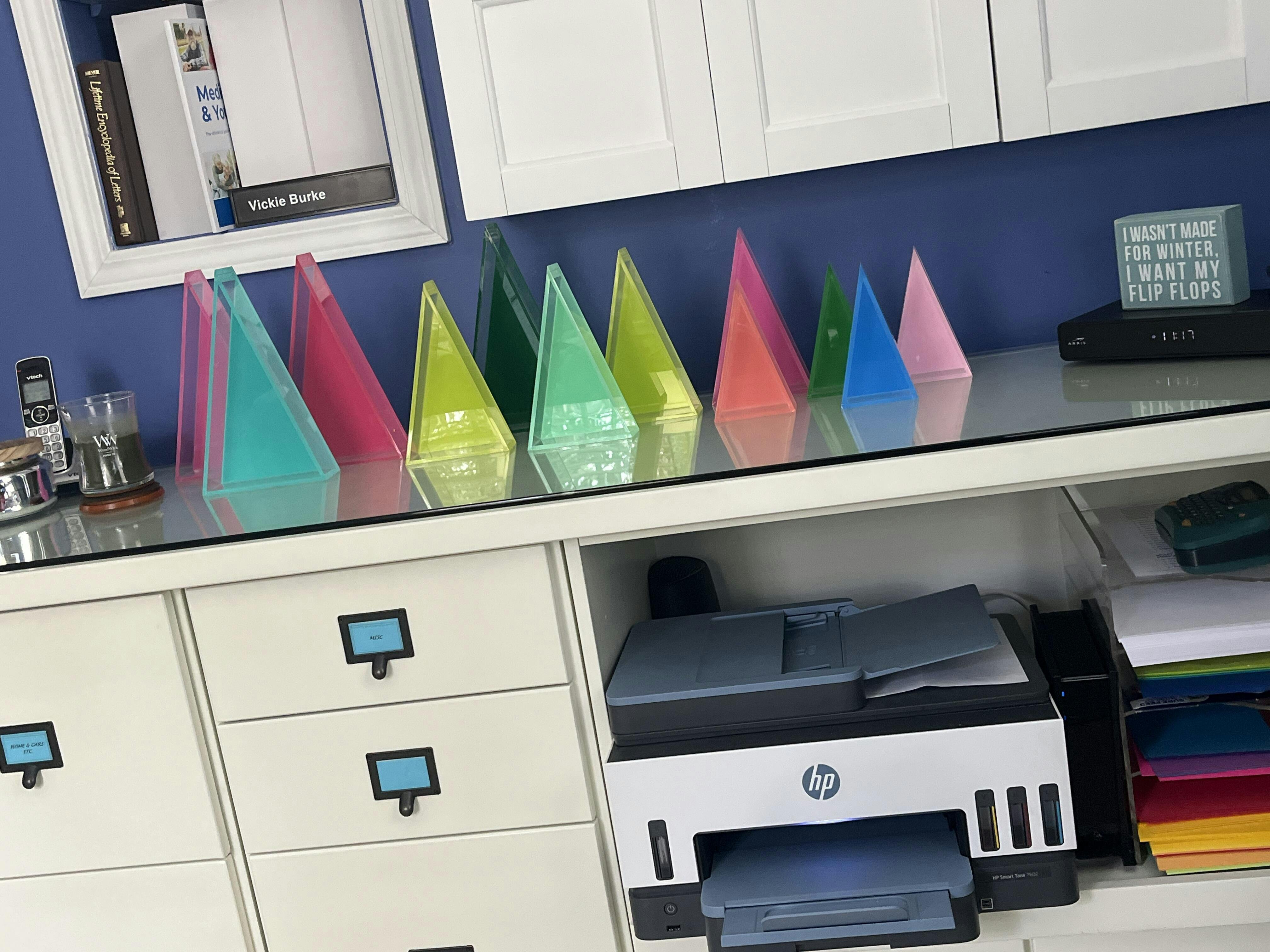 Our modern acrylic trees come in sets of 3 (one 10" tall, one 8" tall, and one 6" tall). Each have a colorful back and clear sides for a modern look. They are perfect on a mantel or grouped together in a vignette.