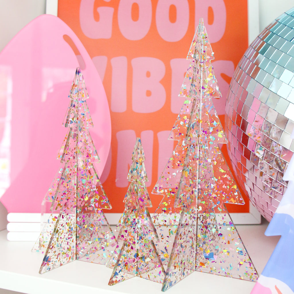 Get festive with our Acrylic Trees in confetti acrylic. Flat packed and easy to assemble! Trees measure 10", 8", and 6" tall. Choose with or without pink bows.