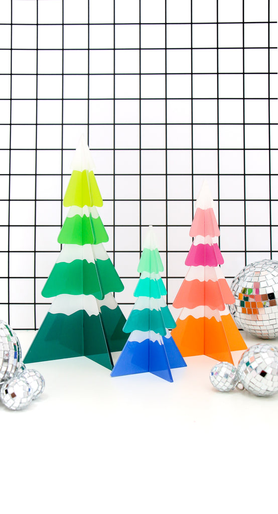 Get festive with our Acrylic Trees in confetti acrylic. Flat packed and easy to assemble! Trees measure 10", 8", and 6" tall. Choose with or without pink bows.
