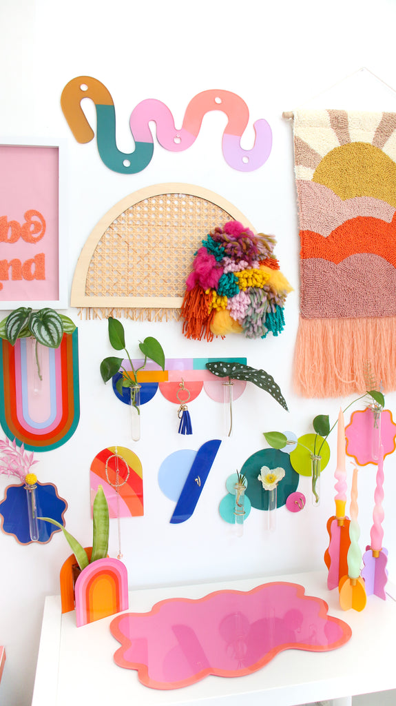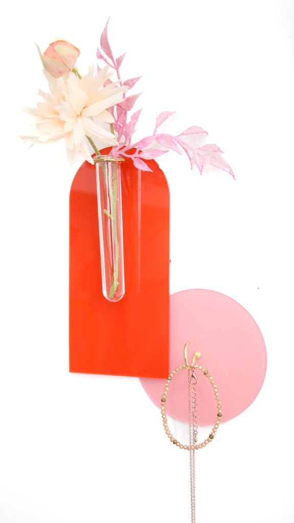 Set of 5 Acrylic wall hooks in shades of bright orange, red orange, periwinkle, dark blue, and light pink. Choose for the set of 5 or buy them individually. Each hook comes with a gold screw in hook to attach them to your wall. Arrange together as shown or in any combination you like. Each hook measures 4" - 6".