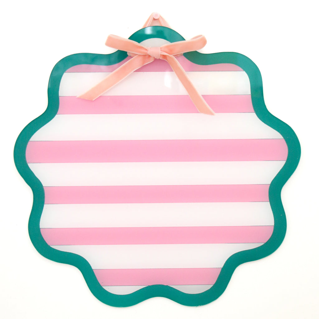 Memo board features pink stripes with a teal border. Works with any dry erase marker (not included). Hang on your wall with ribbon bow hanger included