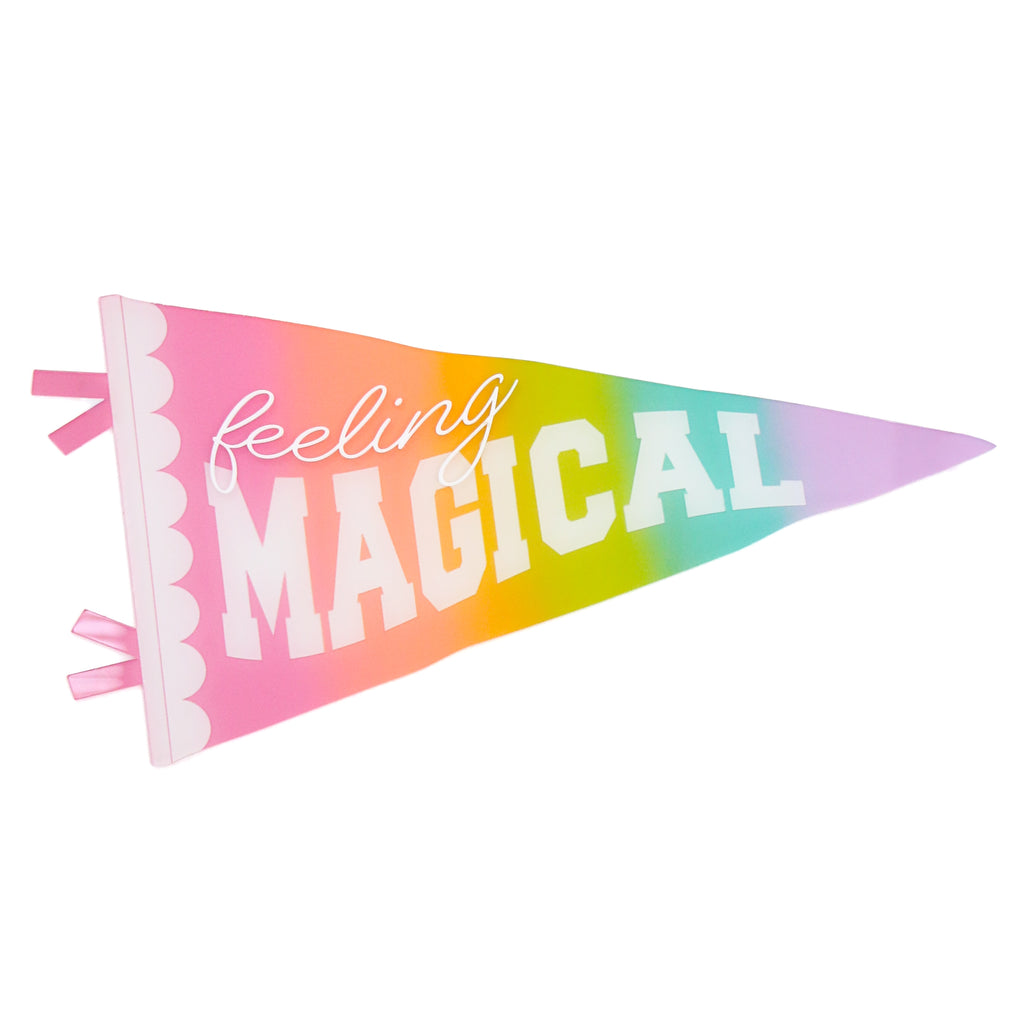 Acrylic hand painted acrylic rainbow gradient pennant wall art sign that spells out feeling magical.  Measures 9" by 16". Hang using removable adhesive wall mounting strips like command brand.
