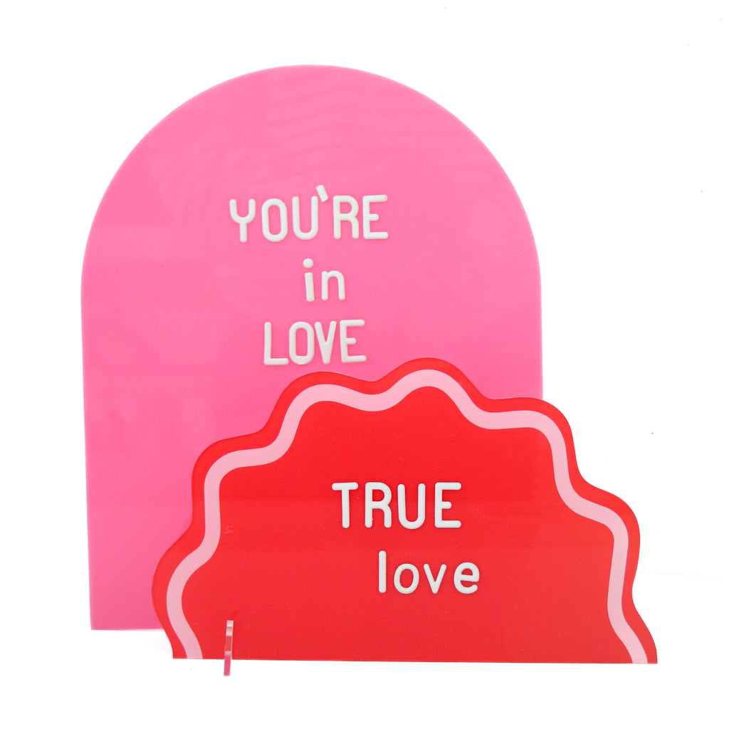 This set of two acrylic decor and party signs can be customized with the included reusable white letter stickers or you can draw on it with a dry erase marker or use vinyl or stickers. Each sign comes with a clear acrylic stand. Display them together or separately. Pink sign measures 12” by 9” wide and red sign is 8” wide by 5” tall.